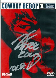This is a copy of the first Cowboy Bebop DVD (“1st Session”) containing the first five episodes, signed by character designer and animation director Toshihiro Kawamoto. Kawamoto’s animation career spans over 25 years, including titles such as Gundam, Escaflowne, Wolf’s Rain, and Fullmetal Alchemist. This piece shows some typical wear for being moved several times in the past decade, but the general condition is good.