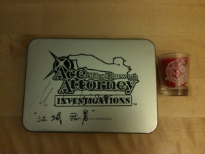 You are bidding on a promotional metal box autographed by Motohide Eshiro, the game producer on Ace Attorney Investigations: Miles Edgeworth. This box was received and signed in Capcom’s booth during Comic-Con 2009 in San Diego. Unfortunately, frilly cravats were not included with the box, so it is empty on the inside, but covered with prosecutor-y goodness on the outside.